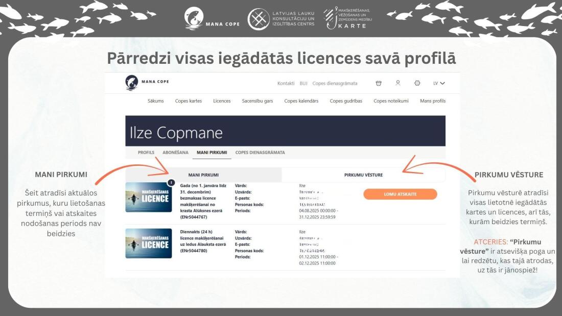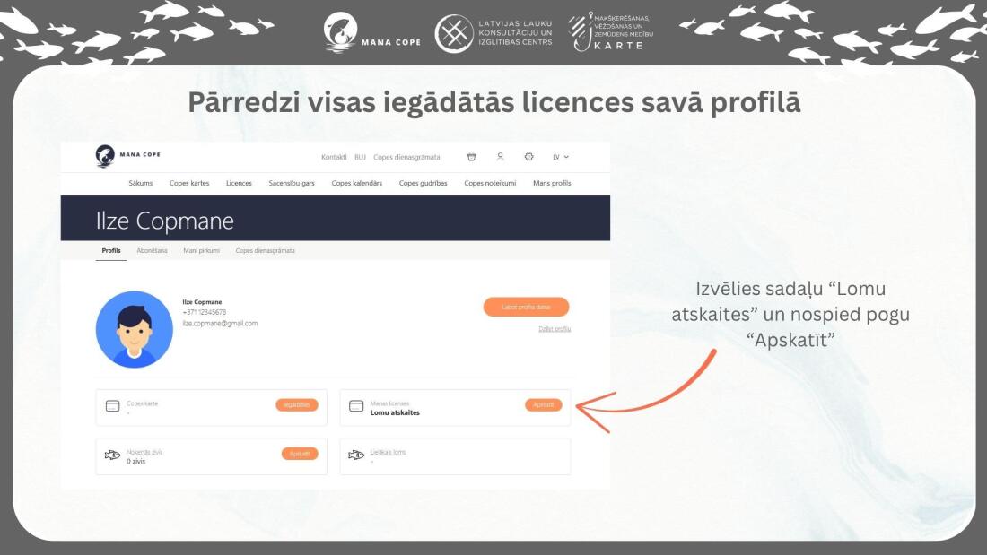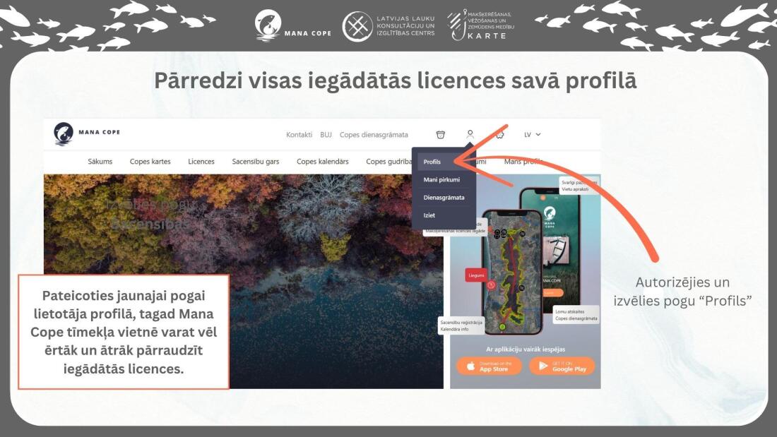 Šī nolūka ietvaros mēs apstrādājam noteikta veida personas datus, kas nepieciešami www.manacope.lv tīmekļa vietnes un/vai lietotnes “Mana cope” lietotāja profila izveidei, lai nodrošinātu tīmekļa vietnē un/vai lietotnē “Mana cope” piedāvāto preču (piemēram, “Makšķerēšanas, vēžošanas un zemūdens medību GADA karte”, “Makšķerēšanas, vēžošanas un zemūdens medību Trim mēnešiem karte”, “Makšķerēšanas licences”) iegādes iespējas, kā arī lai nodrošinātu citu mūsu piedāvāto pakalpojumu (piemēram, mobilās aplikācijas kartes sadaļa) izmantošanu un iespēju Jums sazināties ar mums sadaļā “SŪTI MUMS ZIŅU”.