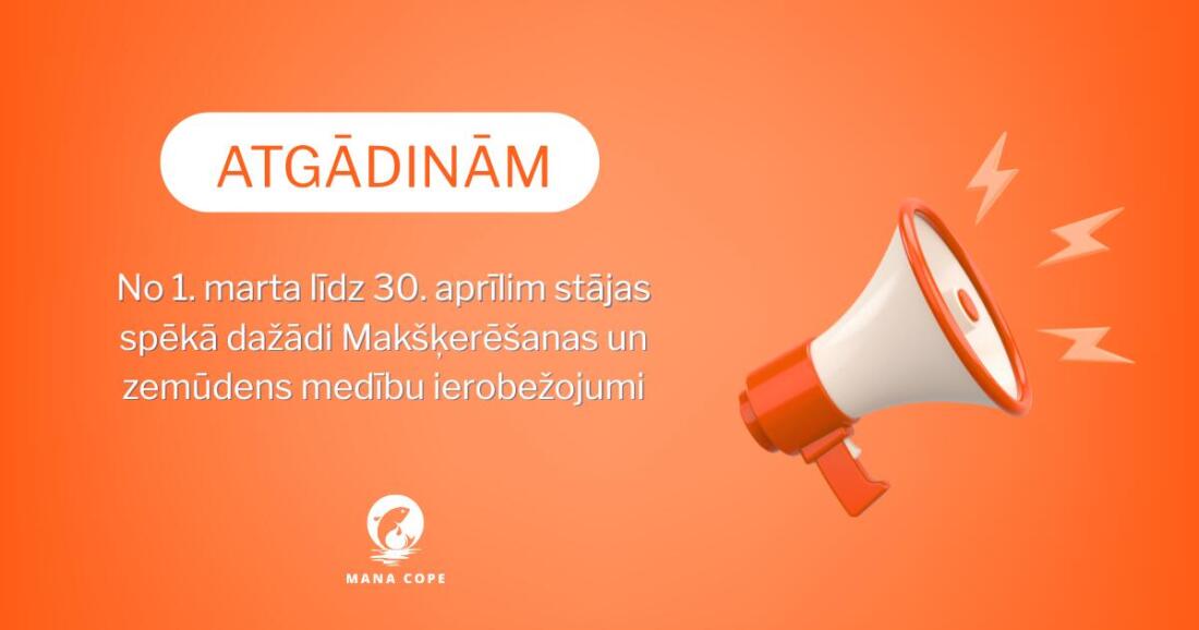 Sākot ar marta pirmo dienu un līdz pat 30. aprīlim, visos ūdeņos ir aizliegta makšķerēšana no laivām un citiem peldlīdzekļiem, izņemot Baltijas jūru un Rīgas līci. Tajā pašā laika posmā visā Latvijā ir spēkā arī zemūdens medību aizliegums (arī šeit izņēmums ir jūras piekrastes ūdeņi un tās vietas, kurās tiek organizētas licencētās zemūdens medības). Tāpat šajos datumos makšķerniekiem jāizvairās no Ministru kabineta noteikumu 2.1 punktā uzskaitītajām ūdenstecēm un caurtekām, jo tajās makšķerēt ir aizliegts.