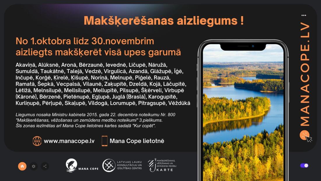 Atceries - pirms dodies makšķerēt, ieskaties "Mana Cope" lietotnē un pārliecinies vai plānotajā galamērķī nav spēkā kādi ierobežojumi. Aktuālos liegums vienmēr ātri, ērti un bez maksas var aplūkot mobilās lietotnes interaktīvajā kartē, sadaļā "Kur copēt?". Tāpat ar apkopotu, detalizētu informāciju iespējams iepazīties aplūkojot rakstam pievienotos attēlus (lūdzam, skatīt zemāk).